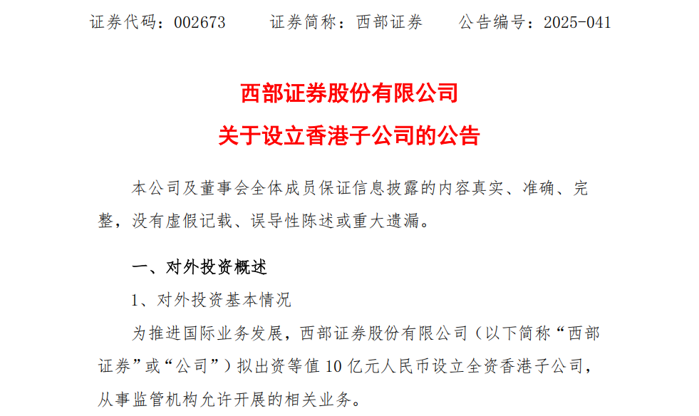 西部证券(002673)于6月12日发布公告称,公司拟以自有资金出资等值10亿元人民币设立全资子公司“西部证券国际金融控股有限公司”(暂定名),注册于中国香港特别行政区。该事项已通过第六届董事会第二十次会议审议,并需提交股东大会批准及监管部门最终核准。