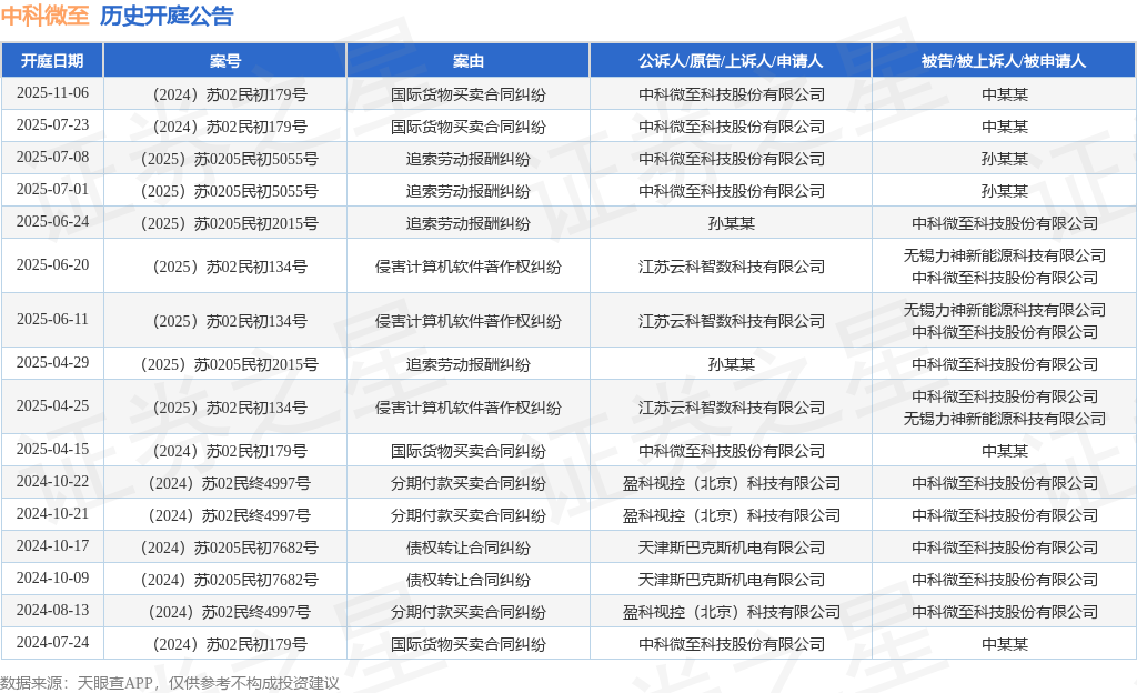 案号:(2025)苏0205民初5055号审理法院:无锡市锡山区人民法院案由:追索劳动报酬纠纷当事人信息: 原告/上诉人:中科微至科技股份有限公司 被告/被上诉人:孙某某开庭日期:2025年7月1日根据统计,近一年内以中科微至科技股份有限公司为当事人的历史开庭公告有16则,其中案由为“国际货物买卖合同纠纷”的公告以4则居首,其次为“追索劳动报酬纠纷”有4则,“侵害计算机软件著作权纠纷”有3则。历史开庭公告如下: