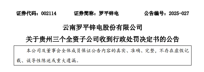 公告显示,罗平锌电下属的贵州三个全资子公司:普定县向荣矿业有限公司(以下简称“向荣矿业”)、普定县德荣矿业有限公司(以下简称“德荣矿业”)、普定县宏泰矿业有限公司(以下简称“宏泰矿业”)近日收到普定县自然资源局及普定县综合行政执法局出具的《行政处罚决定书》。