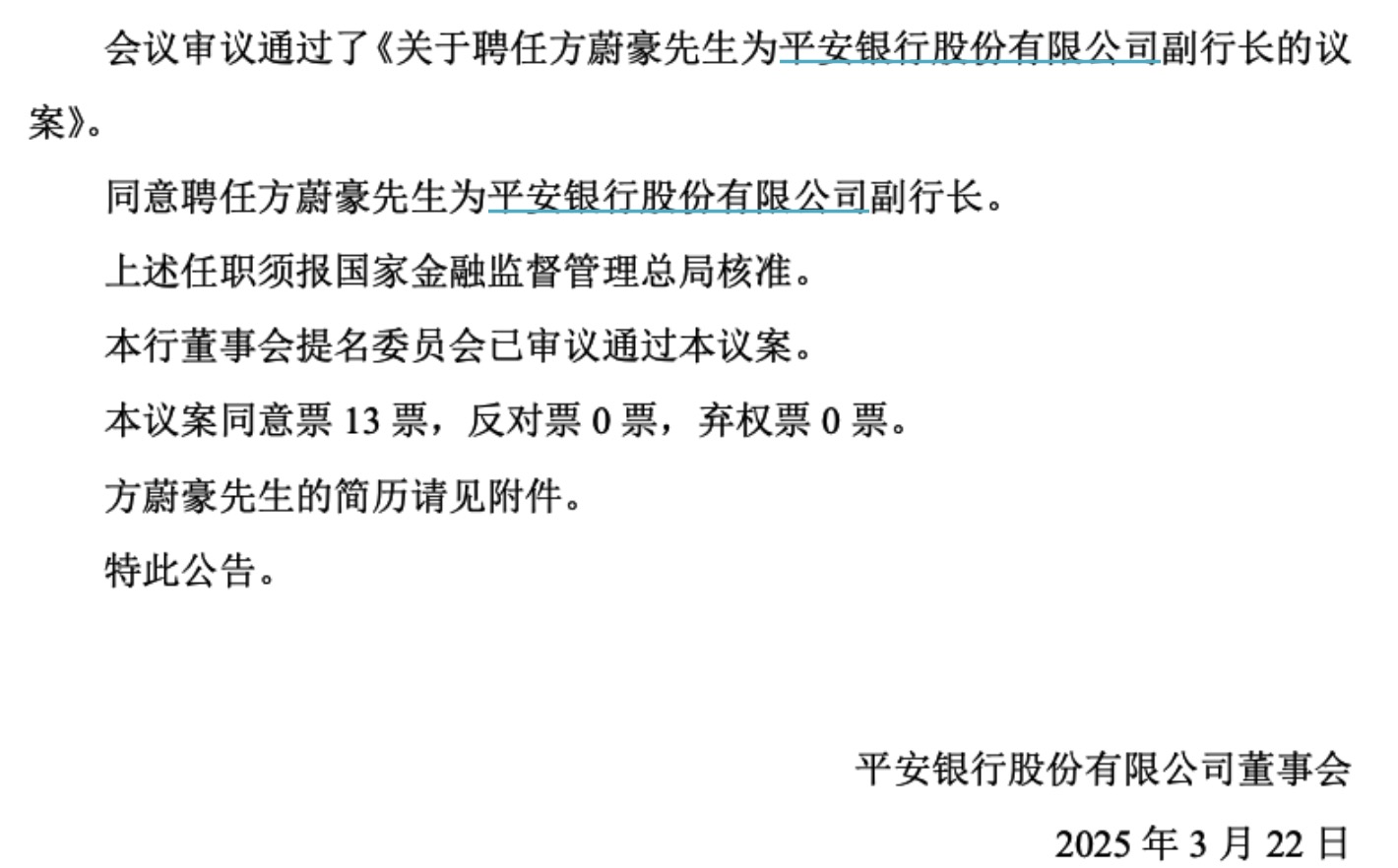 从时间线来看,方蔚豪从董事会聘任到获得监管核准仅用3个月时间。3月21日,平安银行董事会全票通过聘任原平安信托董事长方蔚豪为平安银行副行长的决议,引发行业关注。