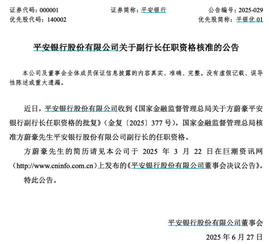上证报中国证券网讯(记者徐潇潇)6月26日晚间,平安银行发布关于副行长任职资格核准的公告。公告显示,近日,平安银行收到《国家金融监督管理总局关于方蔚豪平安银行副行长任职资格的批复》,国家金融监督管理总局核准方蔚豪平安银行副行长的任职资格。