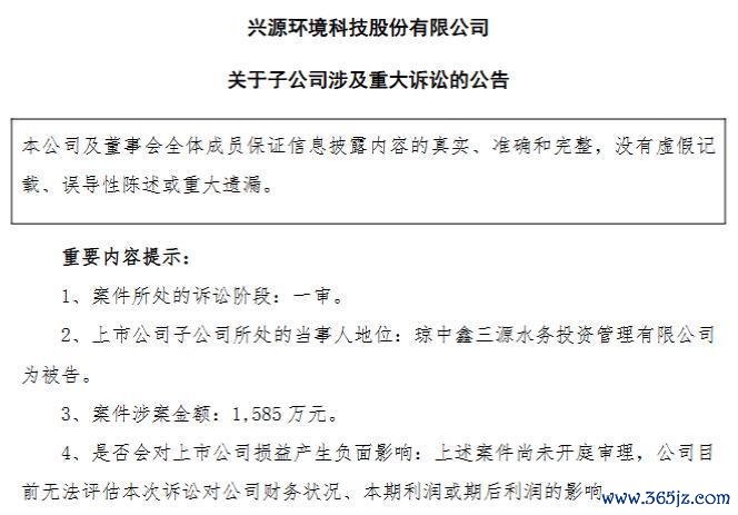 兴源环境表示,上述案件尚未开庭审理,公司目前无法评估本次诉讼对公司财务状况、本期利润或期后利润的影响。公司将按照企业会计准则规范进行相应会计处理,最终影响金额以会计师审计确认后的数据为准。